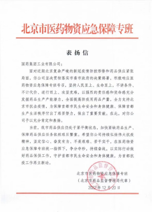 国药工业收到北京市医药物资应急保障专班表扬信