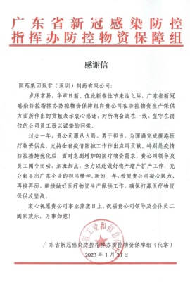 国药致君收到广东省新冠感染防控物资保障组感谢信