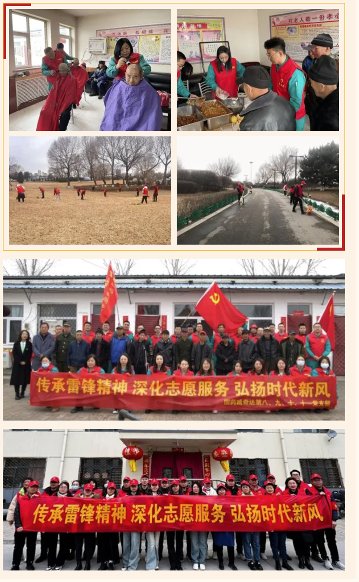 国药威奇达党委、团委以”传承雷锋精神 深化志愿服务 弘扬时代新风”为主题,前往党留庄乡敬老院和经开区敬老院为老人理发、量血压、包饺子、表演节目,来到文瀛湖清扫废弃纸屑、白色垃圾和枯枝落叶,在职工食堂宣传文明就餐理念、维护就餐秩序,去往97岁高龄的红军老战士家中走访慰问老红军前辈,以实际行动让浓浓的暖意流入每一个人心间。