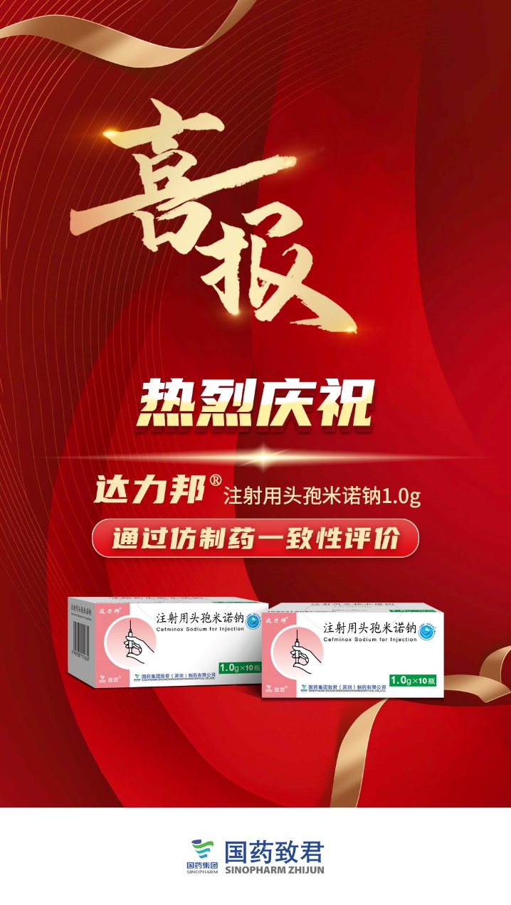 近日,国药致君收到国家药品监督管理局核准签发的注射用头孢米诺钠(1.0g)《药品补充申请批准通知书》,该产品正式通过国家仿制药质量和疗效—致性评价。至此,公司已有15个注射剂品规通过一致性评价。